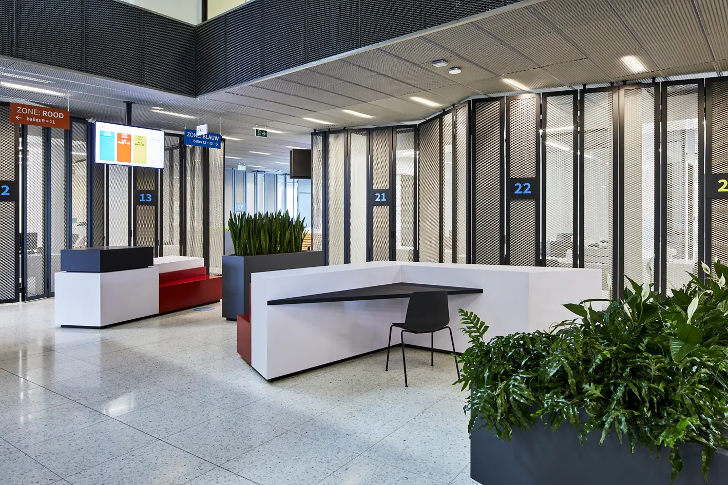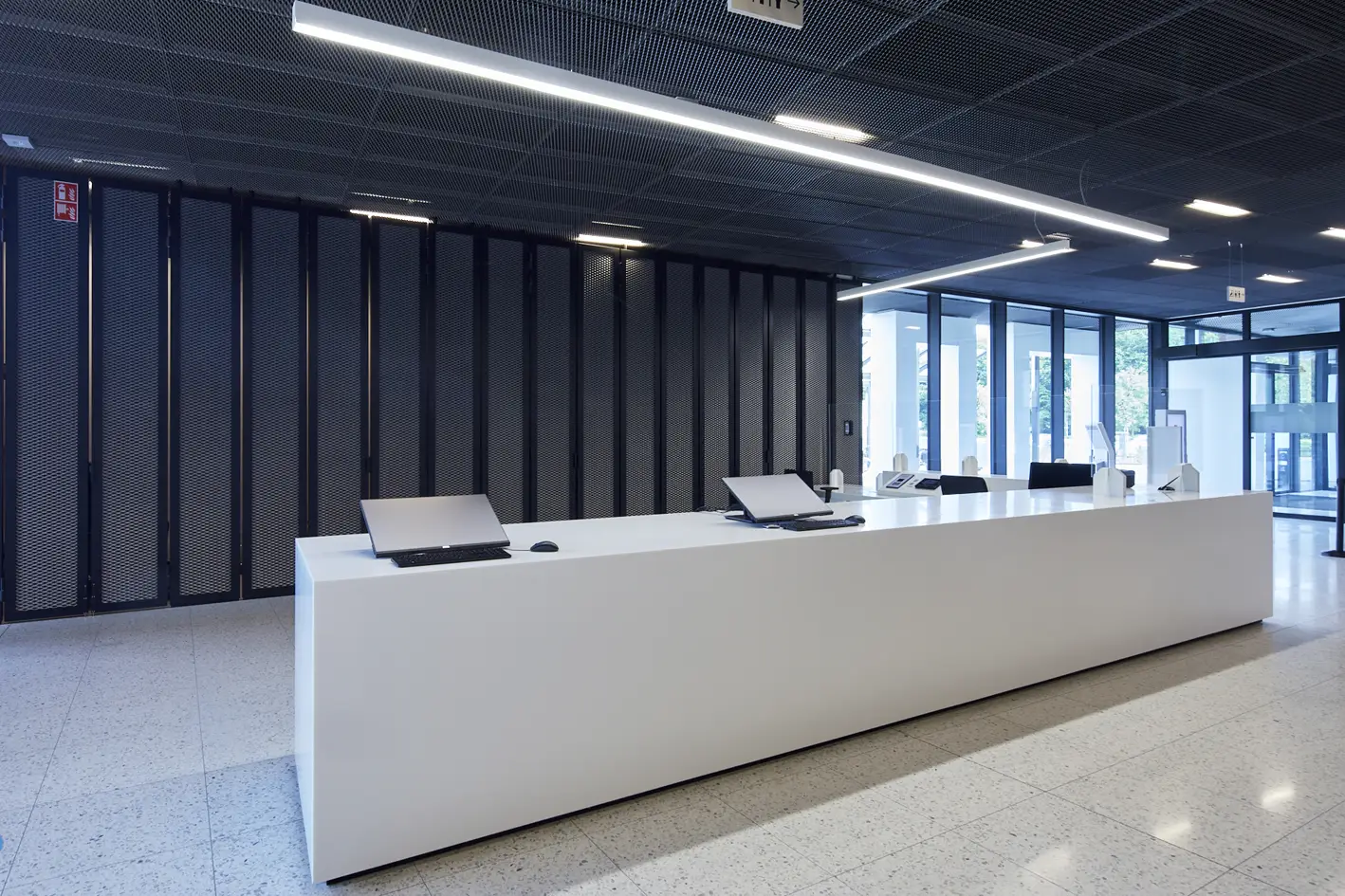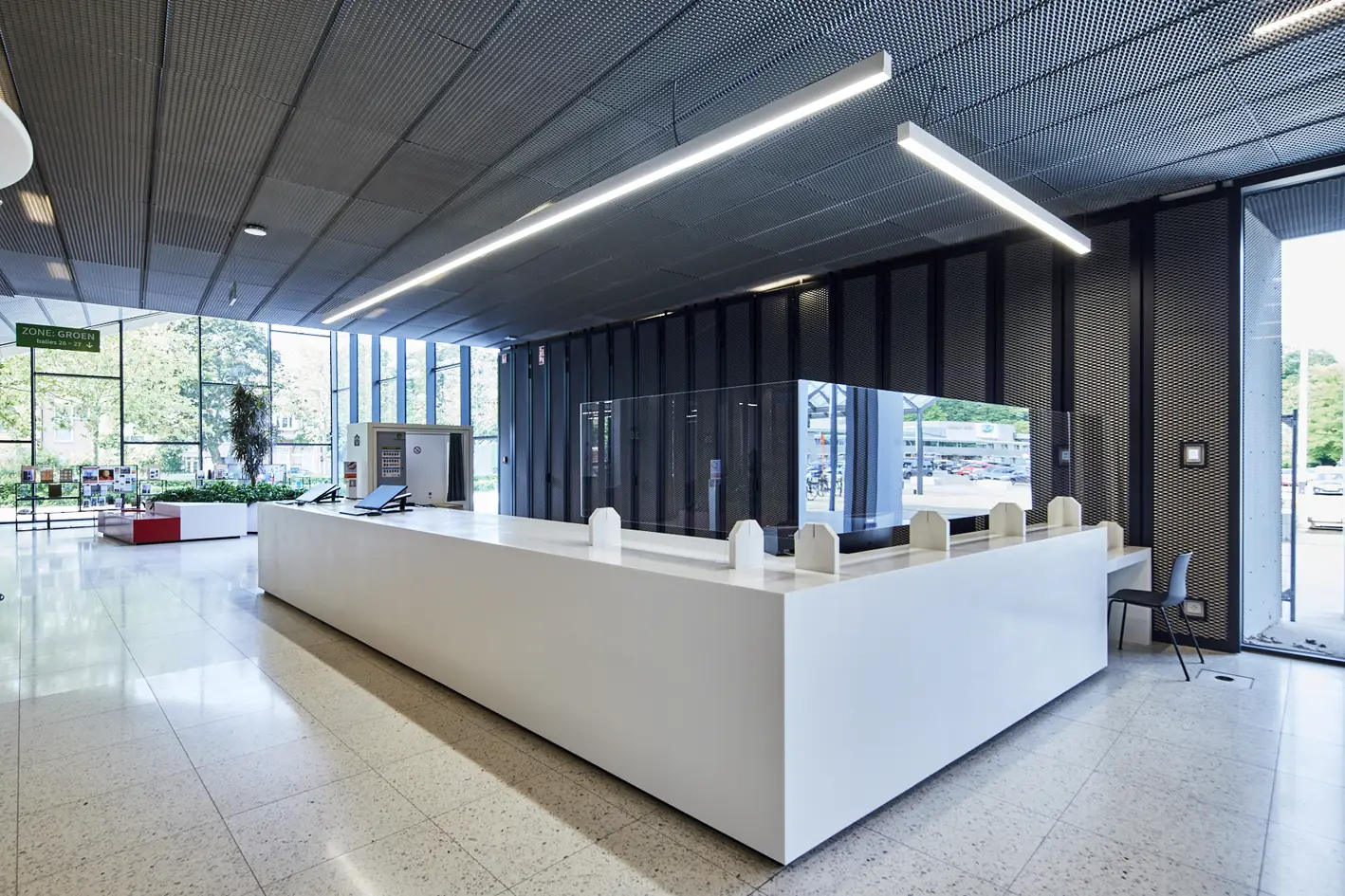 Výroba a montáž nábytku, kancelářských stolů a luxusní recepce z umělého kamene Hi-Macs.Místo: Beveren, BelgieDatum: Prosinec 2020
